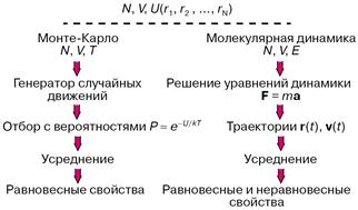 Практически всегда уравнения, связывающие молекулярные параметры и свойства вещества, то есть макроскопические свойства, решаются численно, а эффективность решения существенно зависит от мощности используемых компьютеров. На рисунке 2 показаны схемы двух методик: Монте-Карло и молекулярной динамики, применяемых в компьютерных экспериментах. В обоих случаях задаются число молекул N, объем V, доступный для движения молекул, накладываются те или иные граничные условия, предписывается потенциал межмолекулярного взаимодействия U. В методе Монте-Карло обычно независимыми переменными, сохраняющими постоянные значения при моделировании, выбираются N, V и температура Т. Молекулы двигаются случайным образом в соответствии с предписаниями генератора случайных чисел, и каждое новое расположение либо принимается, либо отбрасывается с вероятностью, определенной по закону