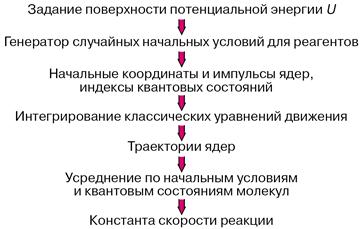 Полное осуществление этой программы в конкретных приложениях крайне затруднительно, даже если из предшествующих квантово-химических расчетов известна поверхность потенциальной энергии. Самой сложной стадией является численное решение уравнений квантовой теории столкновений с учетом перераспределения частиц, то есть как раз наиболее важная для химии стадия. Следует, однако, подчеркнуть исключительную важность научных исследований в этом направлении, поскольку они формируют каркас обшей теории, с которой сравниваются более простые модели. Кроме того, современные экспериментальные методы исследования динамики молекул позволяют измерить парциальные константы скорости и непосредственно сопоставить экспериментальные и теоретические результаты.