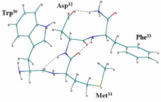 1) Методами молекулярного моделирования сконструирована вероятная биологически активная конформация пептида ССК-4, а также разработана пространственная модель взаимодействия лиганда ССК-4 с активным центром холецистокининового рецептора второго типа.