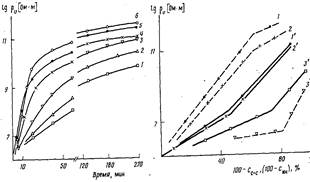 Рис. 3. Зависимость р,, от количества прореагировавших двойных связей сс=с (1—3) и аминог.рупп cnh (i'— 3') в процессе образования олигомера из расплава смеси 1 + Ш (0,33 НИ) при 150 (7, Г). 160 (2, 2'), 200 (5) и 180° (3')