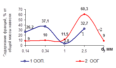 Измельченные ООГ и ООП имеют гранулометрический состав представленный на рис. 3 и неправильную форму частиц.