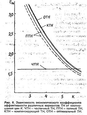 При U = 0.6 и принятом Кп = 1 на рисунке 4.6 получим горизонтальную линию, пересекающую εэк для других вариантов ТН при значениях К > 5,5-5,8. Это свидетельствует, что турбокомпрессоры в схемах ТН выгодно применять при не очень большом соотношении цен за единицу электроэнергии и тепловой (менее 5). При значениях К > 6 в случае одинаковых цен на пар высокого и среднего (рабочего) давлений экономически более выгодным может оказаться частичный ТН.