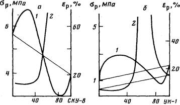 Рис. 5. Концентрационные зависимости ср (1) и ер (2) для совмещенных композиций НЦ — СКУ-8А (а) и НЦ — УК-1