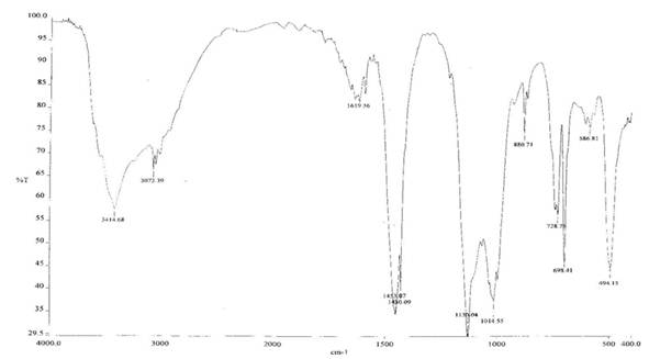 Синтез осуществлен в условиях аналогичных для синтеза мононатровой соли фенилсилантриола в водно-ацетоновой среде. Исходный поликобальтфенилсилоксан был синтезирован по раннее описанной методике в присутствии диметилсульфоксида.[20] В результате синтеза наряду с полимерными продуктами были выделены белое кристаллическое вещество, состав которого отвечает финилсилантриоляту натрия: PhSi(ONa)3 × 6,5H2O, ИК-спектр представлен на рисунке 1.