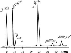 Рис. 1. Разделение изомеров пергидрофенантрена на колонке с ГТС при 250ºС [Киселев А.В. и др.], колонка 2 м × 1 мм, заполненная частицами ГТС диаметром 0,22-0,25 мм |