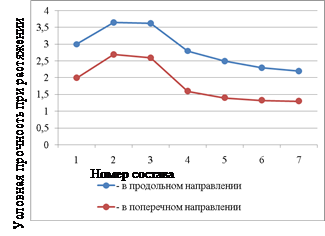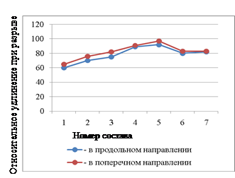 Преимущество первых трех композиций доказывает и зависимость условной прочности при растяжении и относительного удлинения при разрыве в продольном и поперечном направлениях для испытанных составов резинобитумных материалов. При нормах условной прочности при растяжении не менее 3,0 и 2,0 кгс/см² и относительного удлинения при разрыве – не менее 60 и 65% в продольном и поперечном направлениях, разработанные материалы обладают условной прочностью 3,0 –3,8 и 2,0-2,8 кгс/см², относительным удлинением 70-89 и 76-91%.