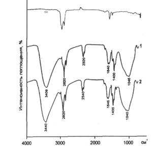 На ИК-спектрах битума присутствуют полосы поглощения СН2 : валентные асимметричные - 2923 см-1, симметричные - 2853 см-1; деформационные СН2: ножничные - 1458 см-1, маятниковые – 722 см-1, деформационные СН3 : ассиметричные – 1458 см-1, симметричные - 1375 см-1; полосы поглощения конденсированных ароматических соединений – 1602 см-1, полосу связанной воды в районе 3200 см-1и узкий слабовыраженный максимум при 1025 см-1 обусловленный валентными колебаниями связи С=О.