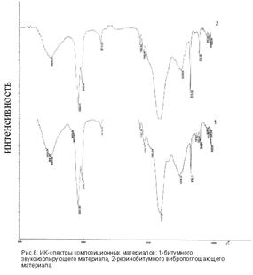 Исследование ИК-спектров компонентов композиционных материалов показало, что для базальтовой ваты (кондиционной и некондиционной) характерны следующие полосы поглощения: 3409 (3440), 2820 (2920), 2320 (2340), 1640 (1645), 1400 (1400), 1045 (1040), 800, 594,7 и 555,7 см-1