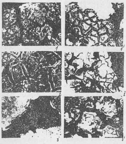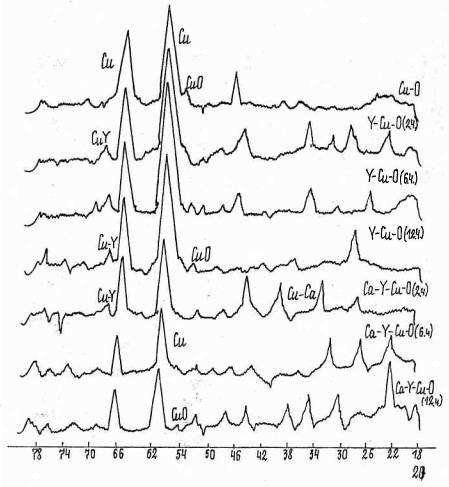 Последующая катодная поляризация в растворе УС в ДШ при -1,8 В сопровождается образованием кристаллов новой фазы. Увеличение времени внедрения иттрия приводит ЭЖ еще большему насыщению поверхности оксидного слоя иттрием. Последующее катодное внедрение Са из раствора Са(С104)2 в ДШ при Екп= -2,6 В в течение 2,6,12 ч.) сопровождается коалесценцией и коагуляцией кристаллов и образованием монолитного слоя. Последующая выдержка Си-0 с внедренным У и Са в растворе УаОН в токе "активного" кислорода приводит к росту ячеистой структуры и увеличению количества дефектов на поверхности (рис.11). Осадок зарастает мелкодисперсной фазой. Аналогичный эффект оказывает и термообработка образцов (950 °С, 30 мин.) перед выдержкой в токе 0g(рис. 12).Увеличение длительности термообработки приводит к растрескиванию слоя и образованию густой сетки мелких пор. По границам трещин просматривается отслаивание оксидной пленки. Сопоставление микроструктурных исследований с результатами рентгеноструктурного анализа (рис.13) показало, что в исследуемой системе возможно формирование структур подобных ВТСП.
