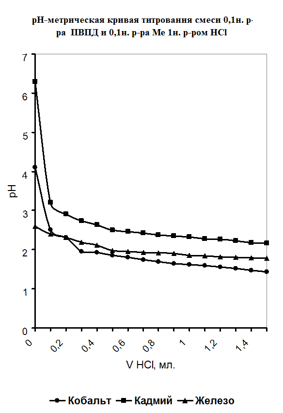 1. Методами рН-метрического титрования и вискозиметрии обнаружено и доказано комплексообразование в системе поливинилпирролидон-Cd2+ и Co2+. Обнаружено, что поливинилпирролидон не образует комплексы с железом (II) в данных условиях.