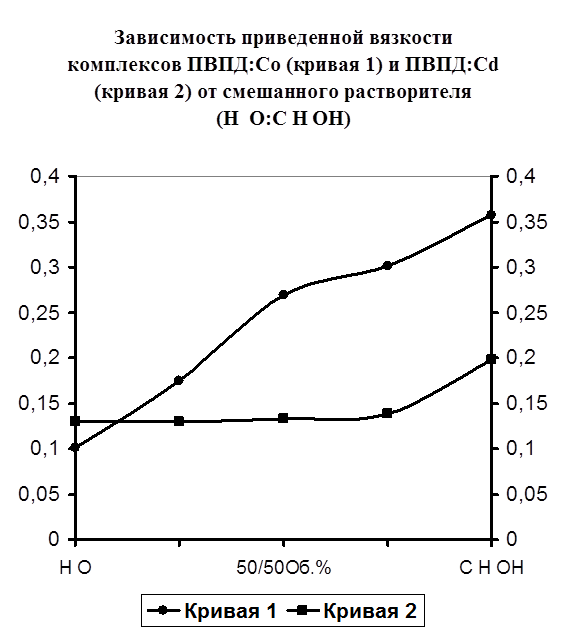 3. Изучено влияние состава растворителя на стабильность металлполимерных комплексов. Обнаружено, что комплекс ПВПД- Cd2+ почти не изменяет приведенной вязкости с увеличением объемных процентов спирта этилового С2Н5ОН, что указывает на его прочность к действию органических растворителей. С другой стороны, комплекс ПВПД-Со2+ сохраняет свои характеристики только в водной среде.