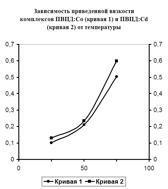 2. Изучено влияние температуры на стабильность образовавшихся комплексов. Было выяснено, что повышение температуры ведет к повышению приведенной вязкости, что свидетельствует о деструкционных процессах полимер-металлических комплексов.