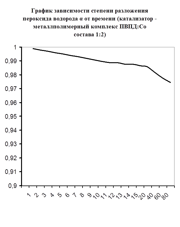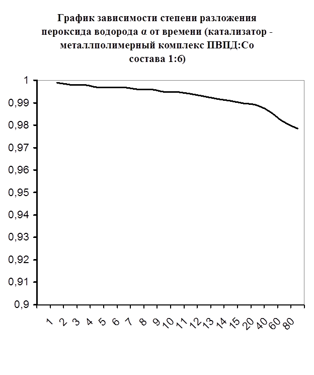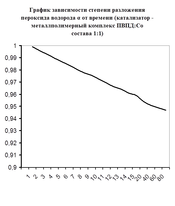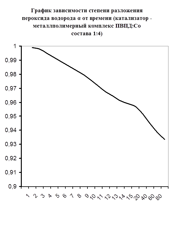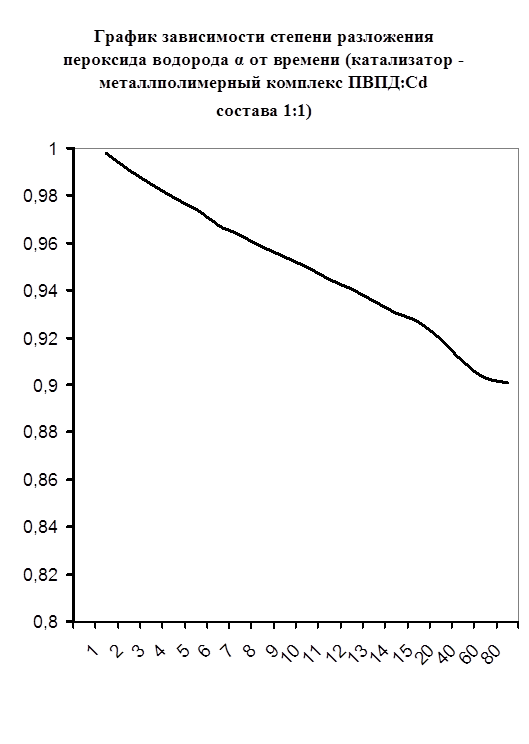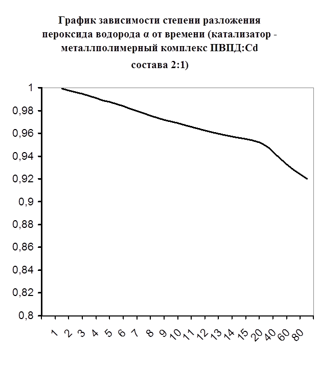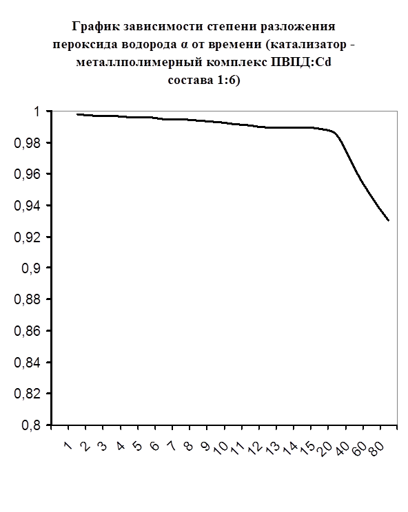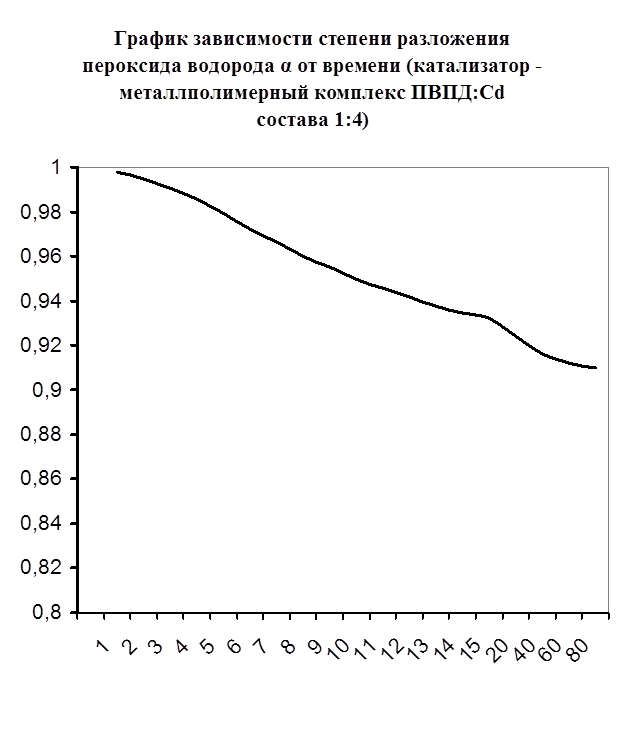 Далее мною проводились эксперименты по изучению каталазной активности полученных металлполимерных комплексов. Проверялась их ускоряющая способность реакции разложения пероксида водорода. Использовались соотношения металл: лиганд=1:1, 1:2, 2:1, 1:4, 1:6. Данные соотношения были выбраны, исходя из координационных чисел иона-комплексообразователя (у Cd и Co координационные числа могут быть 2, 4, 6). Судя по полученным данным, мы можем сказать, что использование растворов полученных металлполимерных комплексов в качестве катализаторов обоснованно, так как они ускоряют данную химическую реакцию, но нецелесообразно, так как ускорение реакции минимально. Самой высокой каталазной активностью обладают комплексы кадмия в соотношении металл: лиганд=1:1 и 1:4. Комплексы кобальта же проявляют самую малую каталазную активность. Однако, если рассматривать графики №13,14,16 то можно выявить постепенное (и достаточно интенсивное для данного случая) увеличение степени разложения пероксида водорода по времени, что указывает на стабильность полученного катализатора.