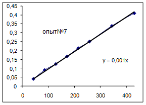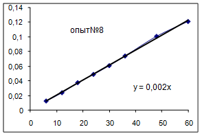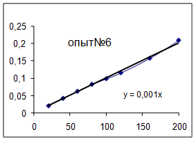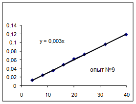 Как видно из уравнений прямых на диаграммах, значение Кнабл для всех опытов, кроме последних двух, одинаково и равно 0,001. Значит, в последних двух опытах действует какой-то другой параметр системы. Причем явно видно, что от концентрации хлора Кнабл совсем не зависит, т. к. для всех первых 7 опытов значение константы одинаково, но значение начальной концентрации хлора разное.