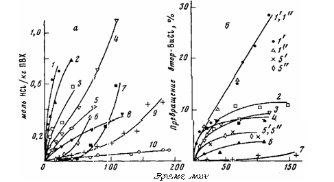 Рис. 5. Влияние полиолов, сложных эфиров на дегидрохлорирование ПВХ при 453 К (а) и втор-BuCl (2-Ю-3 моля) при 393 К (б) в присутствии ZnCl2, а - ПВХ в вакуумированных ампулах в присутствии (моль/кг ПВХ) 0,025 ZnCl2 (2); 0,025 ZnCl2 (1, 3-8) я добавок: 0,1 MOM (1), 0,87 ДОФ (3); 0,86 ОКС (4); 0,1 ДОМ (5); 0,2 ман-нита (б); 0,15 пентаэритрита (7); 0,8 ТЭГ (8). ПВХ без добавок в вакуумированных до ~10-2 Па ампулах (9); в вакууме ~10-2 Па при вымораживании летучих продуктов (10). б: Г— 10~4 моля ZnCl2 1—7 - смеси Ю-4 моля ZnCl2 с добавками (моль-104): Г'-MOM; 2-9,4 ЭГ; 3-2,4 вт-ор-бутилоктилмалеината; 4-8,8 ДОФ; 5'-7,9 ТЭГ; 5"- 6 ВС; 6 - 13 ОКС; 7 - 1,5 пентаэритрита