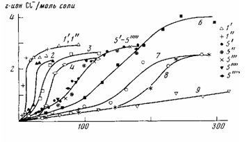 Мы исследовали взаимодействие солей цинка органических кислот с моделью нормальных звеньев ПВХ, втор-BuCl, при 393—453 К. В этом температурном интервале термораспада одного eгo BuCl не наблюдали. Как видно из рис. 6, кинетические кривые накопления ионного хлора при нагревании erop-BuGl в присутствии солей цинка имеют S-образный вид.