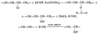 Образование хелатов между карбоксилатами цинка и полиолами приводит к повышению термической стабильности соли и значительному понижению скоростей реакций взаимодействия карбоксилатов цинка с нормальными звеньями макромолекул, что наблюдается экспериментально (рис. 6). Приведенные ниже реакции с нестабильными фрагментами макромолекул ведут к образованию участков, распадающихся под влиянием тепла со значительно меньшей скоростью