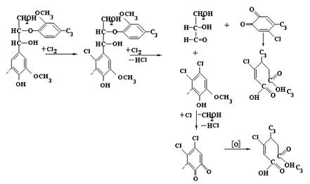 Т.о. при хлорировании происходит электрофильное замещение в бензольном кольце, в том числе и с вытеснением пропановой цепочки, кроме этого происходит окислительное расщепление b-О-4 связи, образование ортохиметильных структур с последующим их окислением до структуры муконовой кислоты. В результате получается хлорлигнин, кроме хлора содержит много карбоксильных групп. При последующей обработке часть хлора замещается на гидроксильные группы в результате хлорлигнин содержит много карбоксильных и фенольных групп хорошо растворяющихся в щелочном растворе.