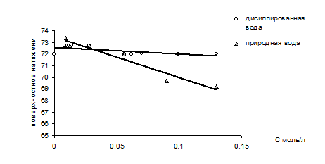 Из рисунка 2 следует, что в растворах с дистиллированной водой ТХУ не проявляет поверхностную активность, тогда как поверхностное натяжение природной воды в присутствии данного компонента незначительно изменяется обратно пропорционально увеличению концентрации растворов.