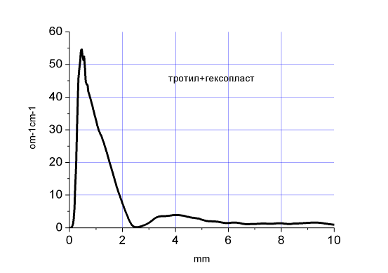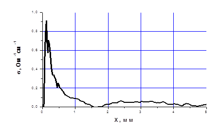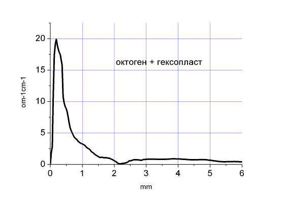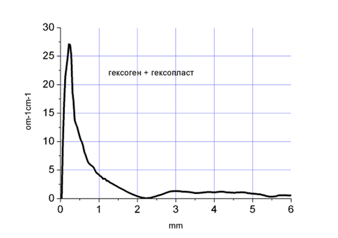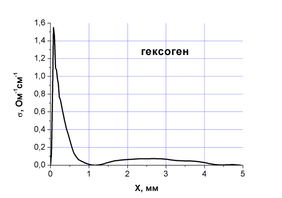 Распределение электропроводности в насыпном гексогене при нормальной детонации.