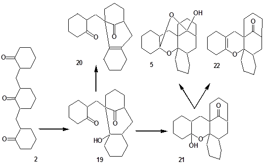 После выделения соединения 5 мы исследовали реакционные смеси. Например, реакционную смесь, оставшуюся от синтеза соединения 5 по методу Колонжа анализировали методом ГЖХ-МС. В ней содержатся 2 изомера дикетона 1 (30 %, соотношение 1:1,), 2 изомера кетола 3 (40 %, соотношение 1:1), 2 изомера соединения 5 (9 %, соотношение 1:2), трикетон 2 (6 %) и циклогексанон (11 %).