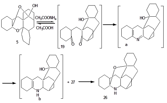 Мы предполагаем, что образование соединений 26 и 27 идет на основе промежуточного продукта циклизации – соединения 19, который в реакции Чичибабина согласно общепринятой схеме [26, 27] образует промежуточный продукт а. В результате диспропорционирования а получается соединение 27, промежуточный енамин b, а из него - соединение 26:
