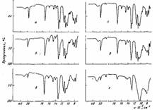 Рис. 4. ИК-спектр полисилоксановых пленок при —196°. Пленки получены в межэлектродном пространстве (а - в) и на поверхности электродов (г - е) при плотности тока разряда: 0,2 (а, г); 0,5 (б, д) и 1,2 мА/см2 (в, е)
