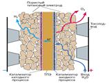 Конструкция водород-кислородных топливных элементов с ТПЭ принципиально не отличается от схемы электролизёра. Топливом здесь служат газообразные водород и кислород, реакции на электродах протекают в обратном направлении по сравнению с реакциями при электролизе, продуктами же являются дистиллированная вода и электрическая энергия. Существуют лишь различия в составе каталитических слоёв на границах раздела электроды/ТПЭ и конструкции электродов. Однако КПД топливных элементов с ТПЭ, известных к настоящему времени, не превышает 50%, а напряжение составляет лишь 0,8 В. Это вызвано в первую очередь низкой эффективностью протекания реакции электровосстановления кислорода при сравнительно низких температурах (80–90°С) функционирования данных устройств. Серьёзным препятствием на пути широкого распространения топливных элементов является также высокая цена получаемой с их помощью электроэнергии — от 3 до 8 тыс. долларов за 1 кВт. Тем не менее, топливные элементы с ТПЭ вследствие своих уникальных качеств (безопасности, экологической чистоты и компактности) нашли применение на подводных и космических кораблях, где их используют для получения пресной воды и электрической энергии.