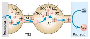 Предположим далее, что такой катализатор найден — некое вещество А (рис. 5). Нанесём слой ТПЭ на поверхность электрода и методом ионного обмена внедрим в него катализатор, заместив часть катионов натрия, находящихся в мембране. В этом случае реакция восстановления вещества Ox будет протекать не на поверхности электрода, а на границе раздела ТПЭ/раствор: Ox + A → Red + A +. Катализатор возвращается в исходную форму, восстанавливаясь на электроде: А + + е – → A. Однако для этого катион А + должен переместиться через слой полимера к электроду и, восстановившись, вернуться обратно к границе раздела полимер/раствор.