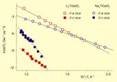 Рис.8. Температурные зависимости проводимости кристаллов Na2TiGeO5 и Li2TiGeO5 вдоль осей a и c.