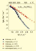 Рис.12. Температурные зависимости объемной ионной проводимости пленок и порошков Li3Sc2–хFex(PO4)3, полученных методом пиролиза диспергированных растворов.