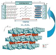 Литийсодержащие фазы привлекательны не только как потенциальные твердые электролиты, но и как электродные материалы для литиевых источников тока - литий-ионных аккумуляторов (рис.13). При наложении электрического поля ионы лития выходят из анода и внедряются в материал катода, создавая эдс. При включении нагрузки происходит разрядка аккумулятора, и концентрации ионов лития на аноде и катоде выравниваются. После этого цикла требуется повторная зарядка системы. Напомним, что электродные материалы должны обладать смешанным, ионно-электронным, типом проводимости. Такому условию отвечают нестехиометрические ванадаты лития. Литий-ванадиевая бронза представляет собой фазу переменного состава, которая образуется при внедрении лития в "туннели" кристаллической структуры оксида ванадия. Сравнение структур бронз различных типов показывает, что наибольшей емкостью по литию обладает бронза типа Li1+xV+4xV+53–xO8.