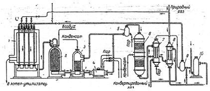 Природный газ под избыточным давлением 0,7 — 0,8 ат поступает в теплообменник 8, в котором подогревается до температуры 380°С за счет тепла газов, исходящих после конверсии окиси углерода. Из теплообменника природный газ подается в аппарат 10, заполненный поглотителем на основе окиси цинка, для связывания соединений серы. Очищенный газ смешивается в аппарате 9 с водяным паром, нагретым до 380°С в пароперегревателе 7 за счет тепла газа после конверсии СО. Парогазовая смесь (отношение пар : газ =5 : 1) с температурой 380°С поступает в трубчатую печь 1, снабженную подвешенными трубами, изготовленными из специальной жаропрочной стали. В трубах размещается никелевый катализатор общим объемом 7,5 м3. Снаружи трубы обогреваются топочными газами, образующимися при сжигании какого-либо газа. Парогазовая смесь проходит через катализатор сверху вниз, при этом температура постепенно возрастает с 400 до 800°С. Степень превращения метана в первой ступени достигает 70%. Конвертированный газ после первой ступени поступает в конвертор шахтного типа 2, куда добавляется воздух. Остаточный метан почти полностью реагирует на никелевом катализаторе при температуре 850 — 900°С. Конвертированный газ после второй ступени содержит до 0,5% метана. Газ из конвертора метана поступает в увлажнитель 3, затем в котел-утилизатор 4 и далее (при 400°С) в конвертор 6.