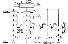 Рис. 4. Блок-схема процесса риформинга метана с получением в качестве целевых продуктов аммиака, водорода, метанола, оксида углерода, продуктов оксосинтеза (Г – горючее для печи; К.П. – конечный продукт); 1 – блок первичного риформинга; 2 – блок вторичного риформинга; 3 – блок I ступени конверсии СО; 4 – блок II ступени конверсии СО; 5 – система отмывки от СО; 6 – аппарат тонкой очистки; 7 – аппарат для удаления Н2; 8 – компрессор.
