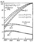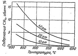 При увеличении концентрации реагирующих веществ происходит также увеличение концентрации образующихся веществ. Для рассматриваемой реакции (3) повышение содержания водяных паров в исходной смеси приведет к смещению равновесия вправо, т. е. к увеличению содержания СО и водорода и уменьшению содержания метана в конвертированном газе. Увеличение количества добавляемого водяного пара особенно важно, когда конверсия метана осуществляется при повышенном давлении. Например, применяя исходную смесь СН4 : H2O = 1 : 4 при давлении 10 атм, можно получить конвертированный газ, содержащий 0,5% метана, при 850°С, т. е. на 110°С ниже, чем при составе исходной смеси 1 : 2.