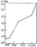 Рис 7. Применяемое давление газа Р на выходе из трубчатого реактора конверсии природного газа в различные периоды времени t.