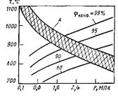 Рис 8. Ограничения по температуре t и давлению Р процесса паровой конверсии углеводорода, обусловленные материалом труб (отношение пар : углерод = 3,5; А – расчетные границы для работ труб; yконв – полнота конверсии).