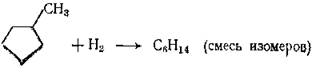 Протекают также реакции, приводящие к раскрытию циклопентанового кольца и к превращению пятичленных нафтенов в парафины, формула 6