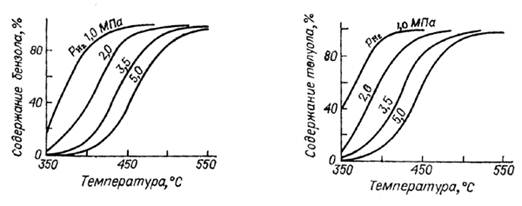 Рисунок 2 − Зависимость содержания бензола и толуола в равновесной смеси с циклогексаном от температуры и парциальном давления водорода
