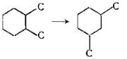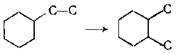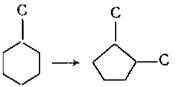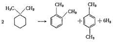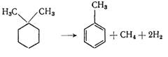 Алкилциклогексаны с блокированными положениями, благодаря наличию в них четвертичного атома углерода (гем-диалкилы), подвергаются дегидрированию на платиновых катализаторах при более высоких температурах, при которых ароматизация сопровождается перегруппировками. Так, при дегидрировании 1,1-диметилциклогексана и подобных ему соединений происходит элиминирование метальной труппы, в результате чего образуются толуол и метан, формула 12