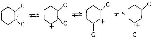 Третичный карбкатион наиболее устойчив и не всегда способен к перегруппировкам. Поэтому протеканию перегруппировок может способствовать образование менее устойчивого, но более реакционноспособного вторичного карбкатиона. Исходя из этого, перемещение алкильных заместителей в кольце цикдогексана можно представить в следующем виде как показано на рисунке 4
