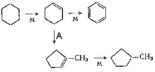 Реакции изомеризации нафтенов протекают по карбкатионному механизму. Промежуточный продукт реакции - циклоолефин, образующийся в результате дегидрирования нафтена на металлическом участке катализатора. Циклоолефин мигрирует на кислотный участок носителя, где превращается в карбкатион. Реакции карбкатиона ведут к образованию изомерного циклоолефина, в результате гидрирования которого на металлическом участке получается углеводород, изомерный исходному. Так, схему изомеризации циклогексана в метилциклопентан можно представить как показано на рисунке 3 (М -металлические участки катализатора, А -кислотные)