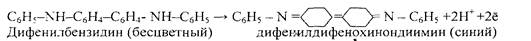 Две молекулы дифениламина отдают окислителю два электрона и теряют два иона водорода. Затем происходит обратимое окисление молекулы бензидина присутствующим окислителем до окрашенного в синий цвет дифенилдифенохинондиимина, при котором молекулы дифенилбензидина также отдает окислителю два электрона и теряет два иона водорода: