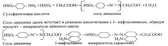 Реактив Грисса - Илотвая - смесь сульфаниловой кислоты HSO3C6H4NIЬ с 1-нафтиламином C10P7NH2. Реакцию проводят в нейтральных или уксуснокислых растворах.Образующаяся в кислой среде в присутствии нитрит- иона азотистая кислота HN02 реагирует с сульфаниловой кислотой, давая соль диазония: