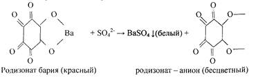 Методика. На листок фильтровальной бумаги наносят каплю раствора ВаС12 и 1 каплю раствора родизоната натрия Na2C6Oe или родизоновый кислоты Н2Сб06. На бумаге возникает красное пятно родизоната бария. На это пятно наносят 1-2 капли раствора, содержащего сульфат - ионы (Na2SO4, K2~SO4 или H2SO4 разбавленной). Пятно обесцвечивается.