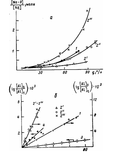 На рис. 1,а представлена серия зависимостей, характеризующих применение по ходу полимеризации количества металлополимерных связей (Me—Р), определенных по тритиевым меткам в полимере после обработки его СНзОТ. Их увеличение с ростом конверсии изопрена и изменение характера зависимостей при варьировании содержания в системе ДИБАГ свидетельствуют о протекании реакций передачи полимерной цепи на алюминийорганические сокатализаторы. Количество действующих активных центров, определенное экстраполяцией зависимостей [Me — Р] / [Nd] — конверсия (прямолинейных в полулогарифмических координатах) к нулевой конверсии изопрена, колеблется от 2 (ТИБА) до 7 — 8% (ДИБАГ) от введенного неодима. Использование ТИБА вместо ДИБАГ в составе катализаторов приводит к более высоким значе- [ ниям констант роста кр (табл. 1). Зависимости lg [А1] 0/ [Al] * — t (рис. 1, б), где [А1] о — начальная концентрация ТИБА или ДИБАГ, а \ [А1], — их концентрация к моменту времени t, также прямолинейны, j что свидетельствует о первом порядке реакций образования алюминий-полимерных соединений по ТИБА (или ДИБАГ). Поскольку доля алюминийполимерных соединений к концу процесса полимеризации не превышает 10% от общего количества алюминийорганических соединений, их повторное взаимодействие с активными центрами можно не учитывать и рассматривать реакции передачи полимерной цепи как необратимые