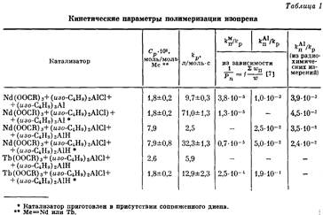 В то время как кинетические закономерности полимеризации бутадиена на лантаноидсодержащих каталитических системах изучены довольно подробно [1], сведения о кинетике полимеризации изопрена, имеющиеся в литературе, носят отрывочный и формальный характер [2]. Настоящая работа проведена с целью изучения основных реакций, обусловливающих формирование молекулярной цепи полиизопрена, и их количественной оценки. В качестве катализаторов были использованы продукты взаимодействия карбоксилатов неодима (либо тербия) с диизобутилалюминийхлоридом (ДИБАХ) и триизобутилалюминием (ТИБА) пли диизобутилалюминийгидридом (ДИБАГ). Каталитические системы этого типа в настоящее время широко описаны в литературе [3—5].