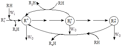 В целом механизм процессов крекинга парафинов, олефинов, скелетной изомеризации парафинов и олефинов, реакций деалкилирования алкиларенов является цепным с кинетической точки зрения. Все эти процессы включают стадии инициирования, зарождения активных центров R+ (Wi), стадии продолжения кинетической цепи с участием ионов карбения и карбония и стадии обрыва активных R+ (W0) за счет примесей в реакционной смеси. Добавки долей процента олефинов к чистому алкану резко ускоряют процесс каталитического крекинга.
