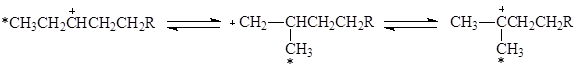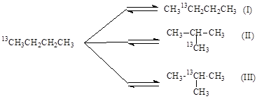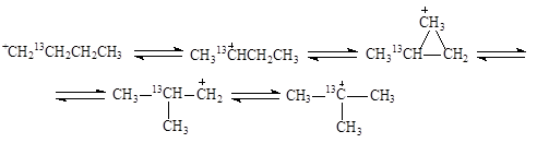 Вместе с тем, 1,2-перенос алкильной группы не объясняет факты, установленные при изучении изомеризации меченого 13С бутана. Обнаружены два изомера и две пары изотопомеров:
