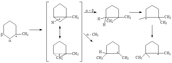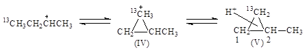 Образование изомеров I и III нельзя объяснить 1,2-переносом CH3-группы. Механизм этих реакций объясняют с позиций образования ионов карбония. При 1,2-сдвиге метильной группы в первичном ионе карбения образуется ион карбония (IV), который можно рассматривать как продукт протонирования циклопропанового кольца (V):